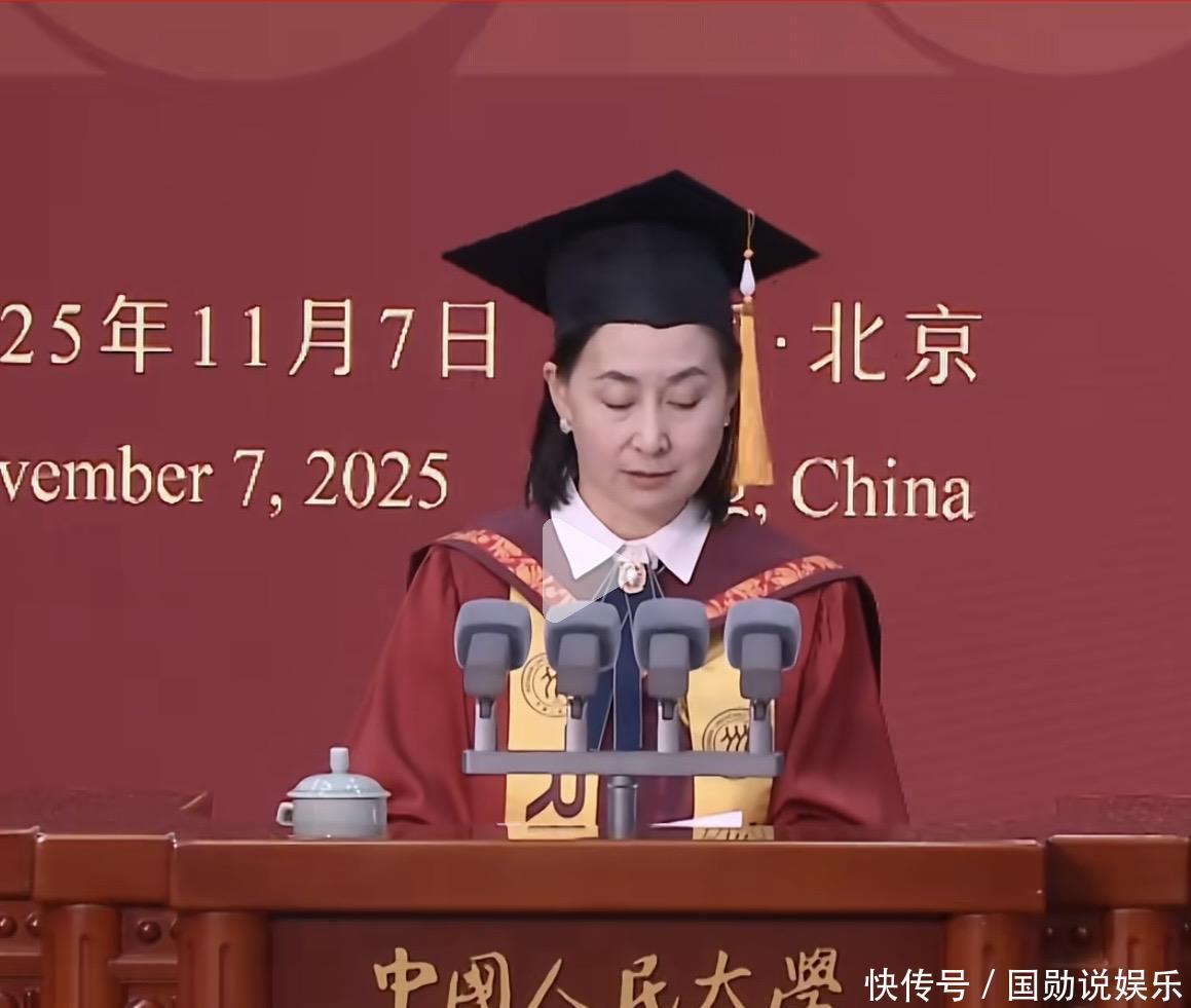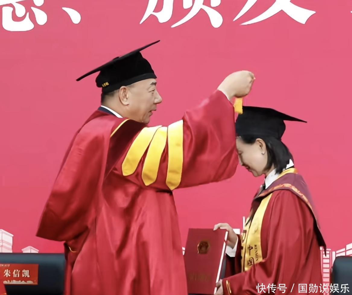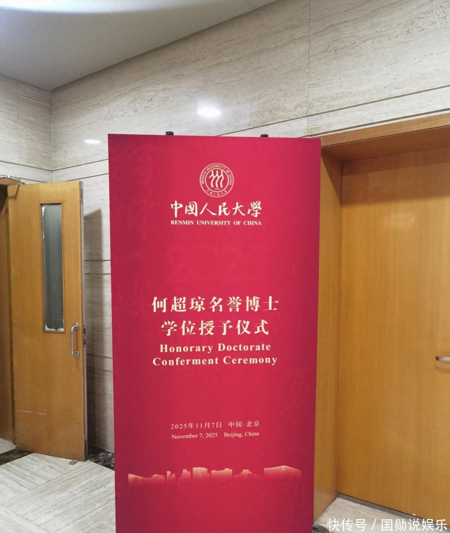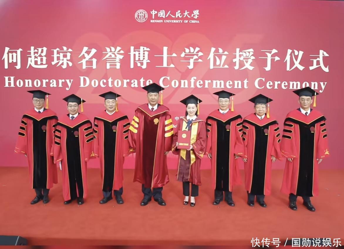 何超琼现身中国人民大学,参加授予仪式,而中国人民大学专门为何超琼设立了一个授予仪式,可见这个名誉博士还是颇有分量。在授予仪式现场的舞台上,背景墙上写着“何超琼名誉博士学位授予仪式”。何超琼在场内穿着博士袍,当天她是素颜现身——何超琼在社交礼仪方面很有讲究,不同的场合会有不同的妆容,在一些庄重、正式的场合,她多半都是以素颜的状态现身,尊重场合,也让自己显得谦虚。